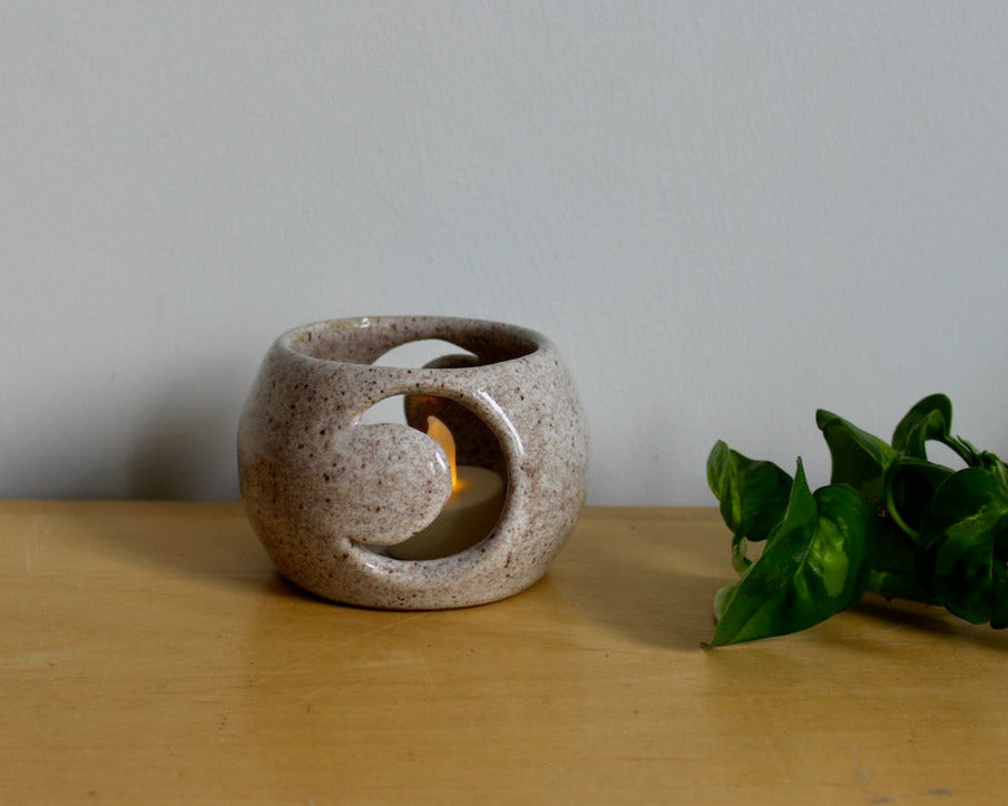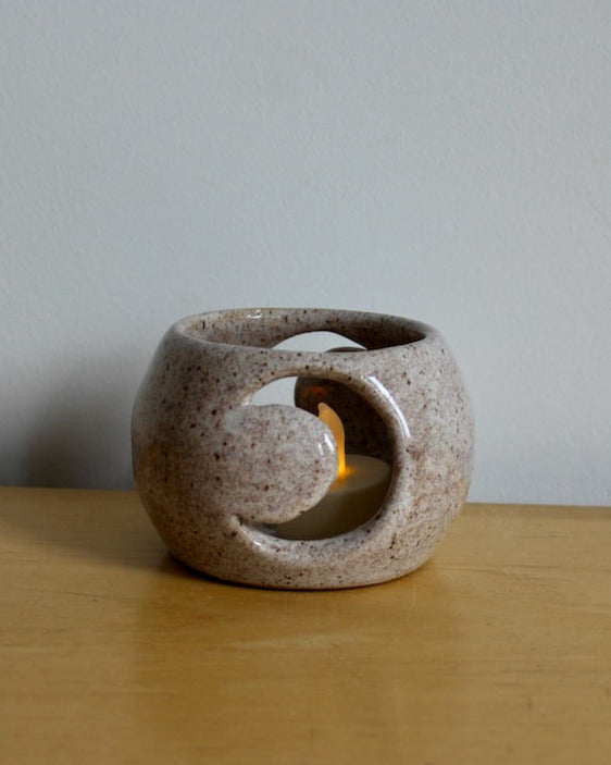 Crescent moon luminary made from speckled stoneware clay and glaze. This flickers beautifully with a tea light or small candle inside of it.