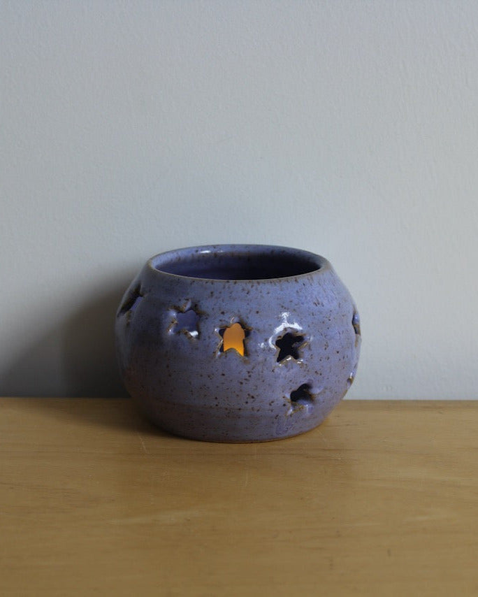 Crescent moon luminary made from speckled stoneware clay and glaze. This flickers beautifully with a tea light or small candle inside of it.